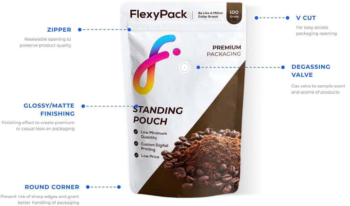 Metallized Stand-Up Pouch from FlexyPack offers optimal protection from water, air, and light, preserving your product freshness and quality for extended time. Metallic effects exude elegance and charm on your product packaging.