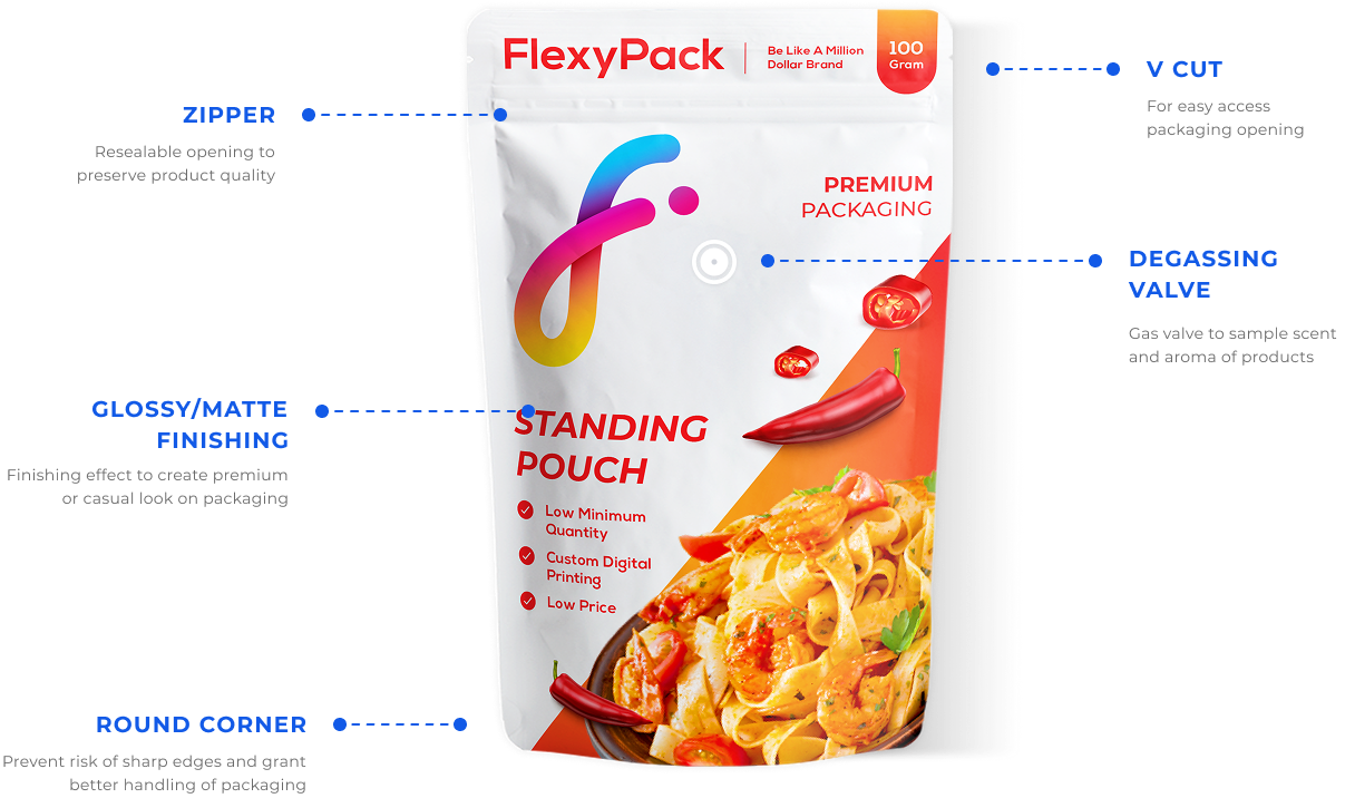 Nylon stand-up pouch from FlexyPack offers best resistance from pressure, puncture, and scratch, as well as preventing clotting and dilution of your product to maximise your product texture, structure, freshness, and taste. Transparent window feature allows for additional attraction and product showcase to your customers.