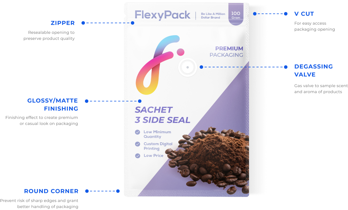 Metallized Lay-Flat from FlexyPack consist of double layer material to give optimal protection from water and air. With metallic effect for better visual looks, as well as flexibility for distribution and storage, Metallized Lay-Flat becomes the best affordable choice for your product packagings.