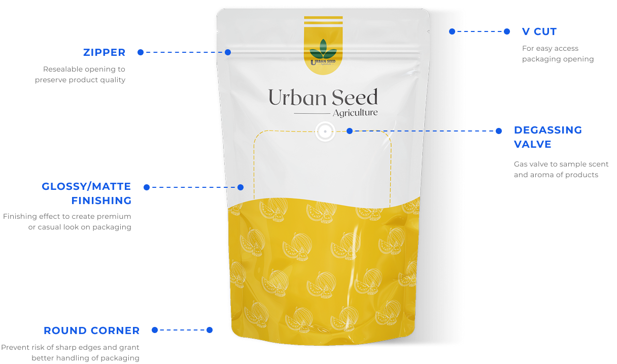 Stand-up pouch is compatible for coffee, tea, and powder drinks for display purposes as well as practical purposes with accessories support (zipper/degassing valve).